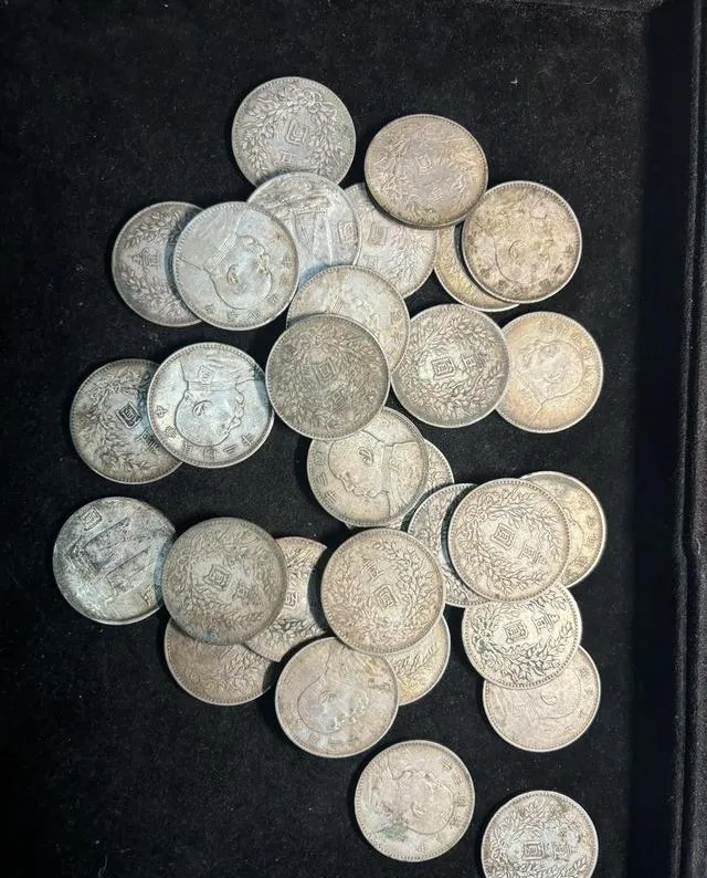 这一张也是黑底摞银元,仔细瞅,面上的图案老得很,有的厚有的薄,都有年头,掂一掂分量,一下穿越回去,爷爷说看银元不能只看表面,包浆越顺越老道,真东西你拿在手里可舍不得放,市面那么多溢价,大部分都出在品相上,开价都要凭点眼力。