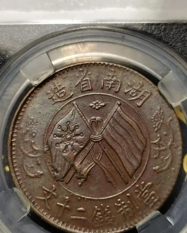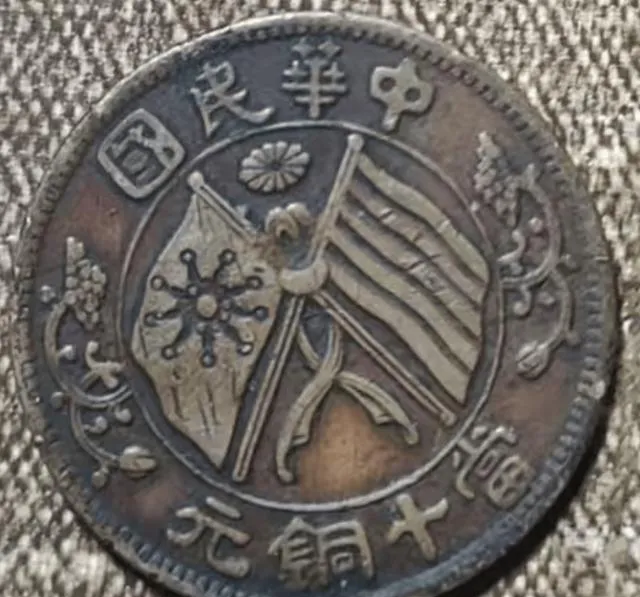 这个常见的版别,就叫做**“河南版菊花双旗铜币”**,外观看着和上面那几样差不多,两个旗一交,大菊花当中间,边上枝叶缠着,不仔细看都分不清,就这很容易让人拿去当镇宅废铜。