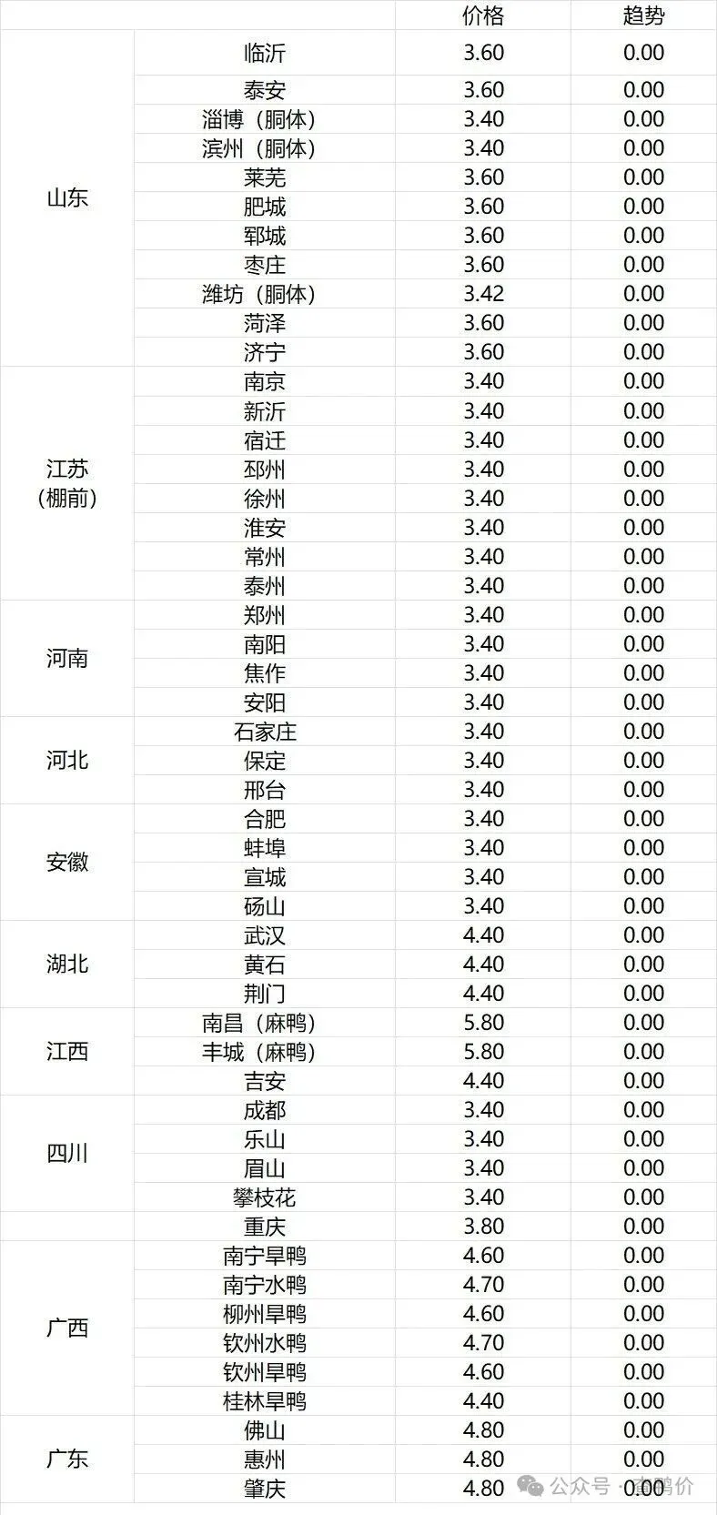 微评:鸭苗报价稳定。(注:南方只报当天价格)排苗节奏放缓,规模场补栏趋于理性。根据产品、养殖成本及鸭苗现状分析,预计近期鸭苗价格呈稳定为主趋势。种蛋报价稳定。温馨提示:该价格为主流厂家报价,实际销售价格以成交价格为准,价格仅供参考。