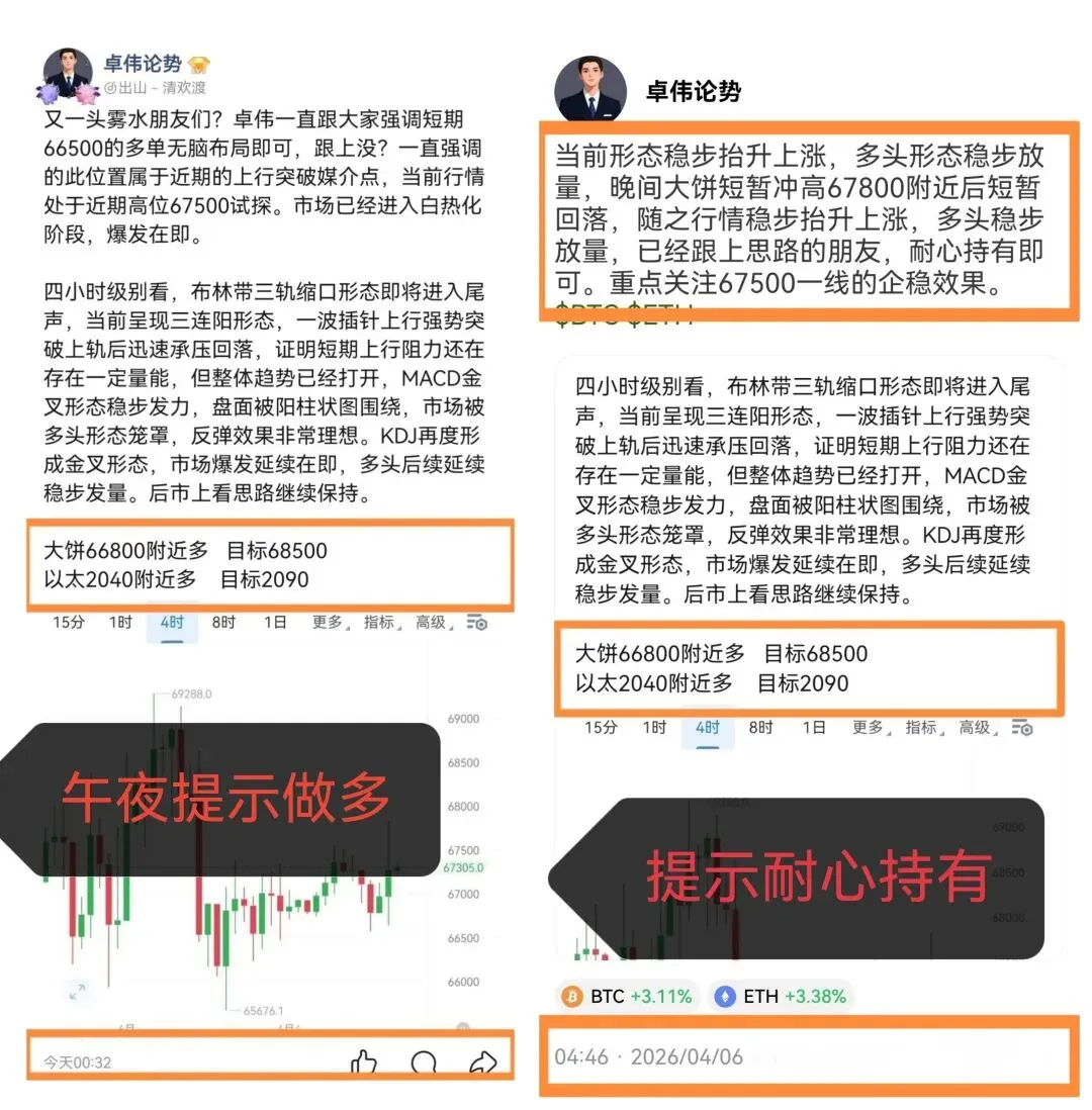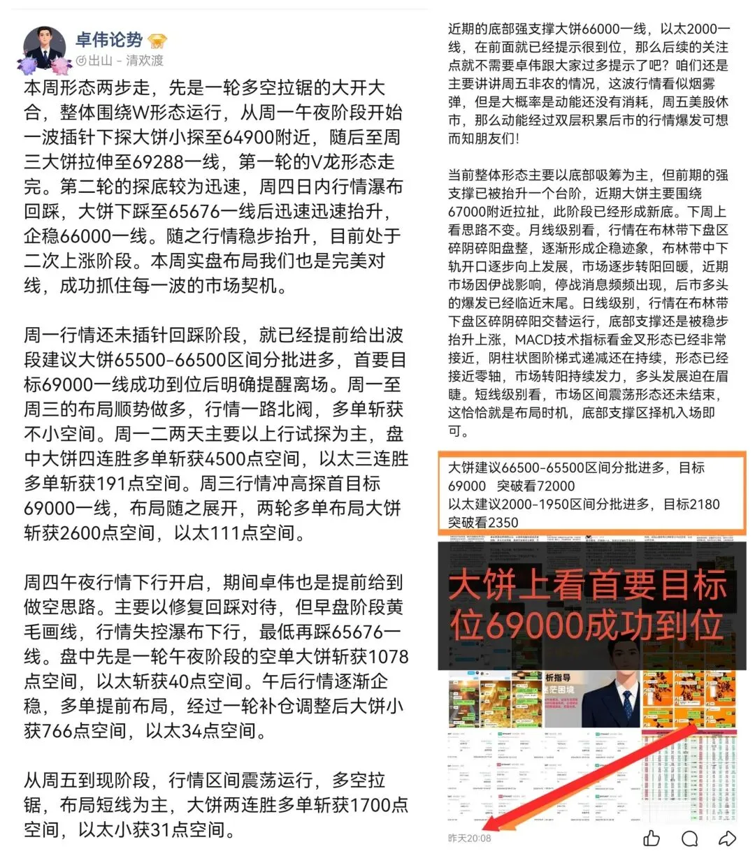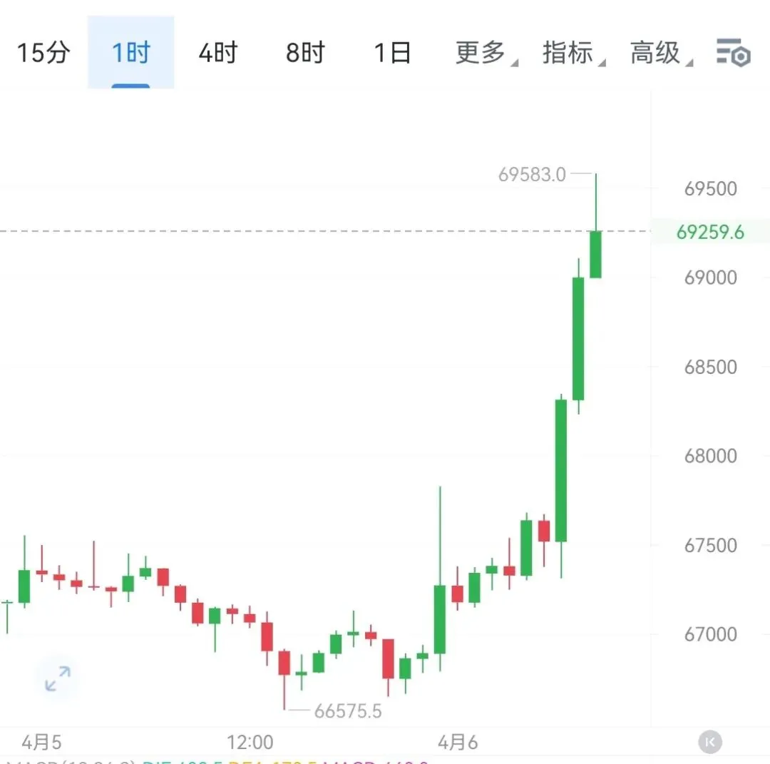 本周也是来了一波开门红!早盘一波不讲理拉伸,市场风雨起势,大饼从午夜阶段67000附近一路北上涨至69853一线,以太同步上涨至2135一线。思路上卓伟已经提前明示到位,上周的非农动能肯定是还没有去消化,就等本周开始来波大的,确实行情也是如期爆发。
