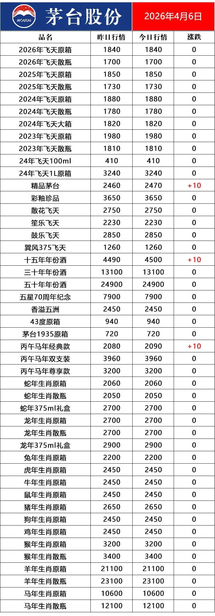 4月6日飞天茅台最新行情——飞天全线大涨!
