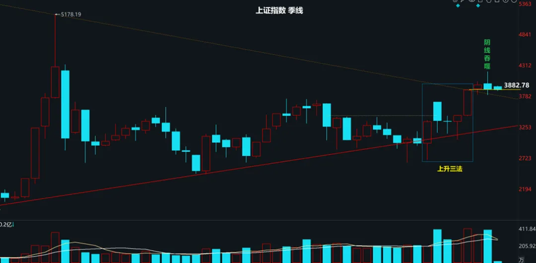 下面是1季度K线收官形态,为阴线吞噬偏空信号,不过下季度收涨即可消除该偏空信号。另外,季线在走出上升三法形态后,25S4和26S1两个季度K线均收在25S3大阳线收盘价3882.78之上,可谓是强势整理!