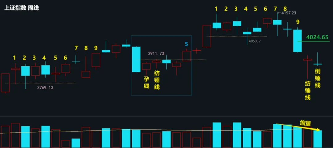 当大阴线出现后,最近3周有走前面蓝色框里的走势,均是大阴线后连续出现偏多信号。前面是历时5周收复压力位,这里我们可以关注需要多久收复4024.65阵地,越快收复则表明多头力量越强!注意哦,这一点位和月线压力位很接近,也侧面说明控盘者的技术之厉害。