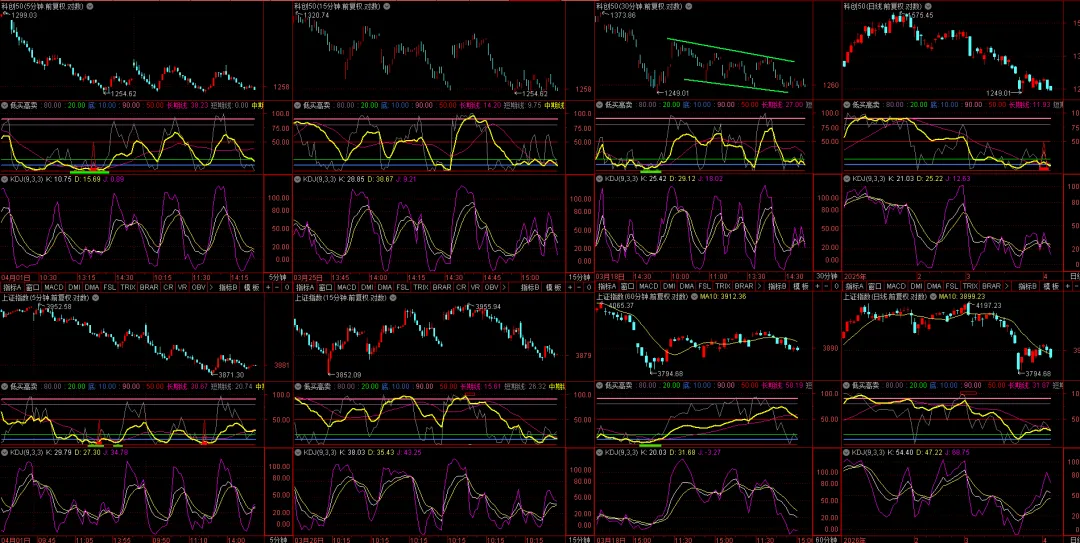 下图上排依次是创业板指的5分钟图、15分钟图、60分钟图、日线图。