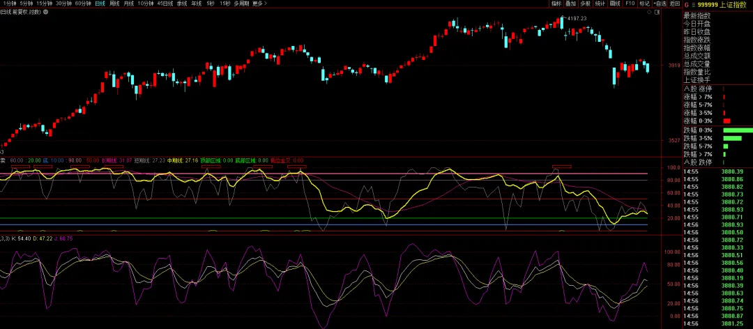 下图下排依次是上证指数的5分钟图、15分钟图、60分钟图、日线图。