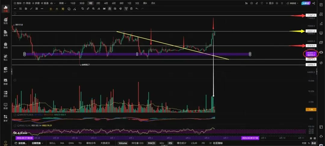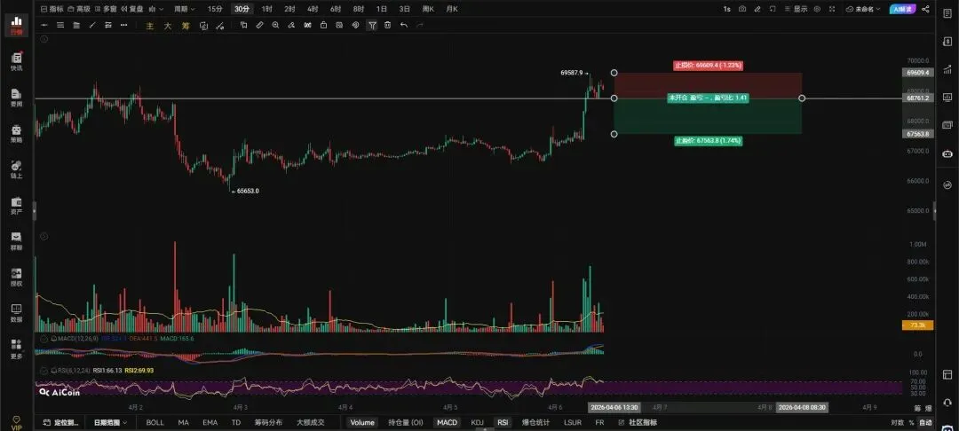 大饼带量突破69356右侧追多激进派上,要么你就等回踩67993再多,跌破67000就止损向上看前高,68760带量跌破反抽无法收回右侧追空。