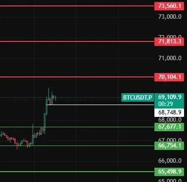 如果今天回踩跌破68750这个位置,那1小时级别开始回调,下方支撑位留意67680-66750-65500这几个位置附近!