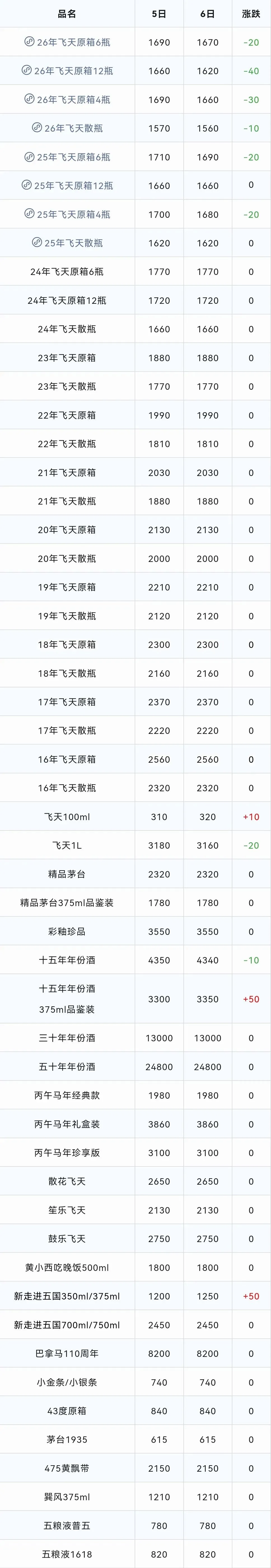 常规茅台中:2026年飞天原箱6瓶装、2026年飞天原箱12瓶装、2026年飞天原箱4瓶装、2026年飞天散瓶、2025年飞天原箱6瓶装、2025年飞天原箱4瓶装、公斤茅台、十五年年份酒下跌;100ml飞天、375ml十五年年份酒品鉴装上涨;