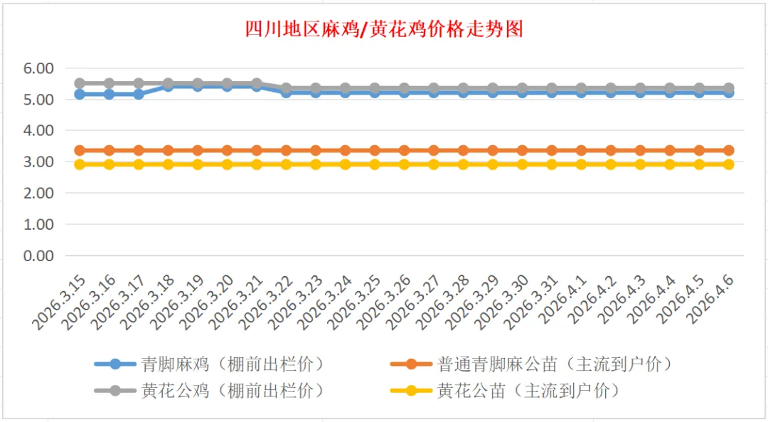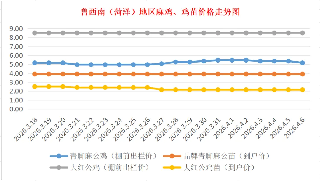 品牌青脚麻公苗(多品种快大型):价格稳定,到户价4.50元/羽,稳。
