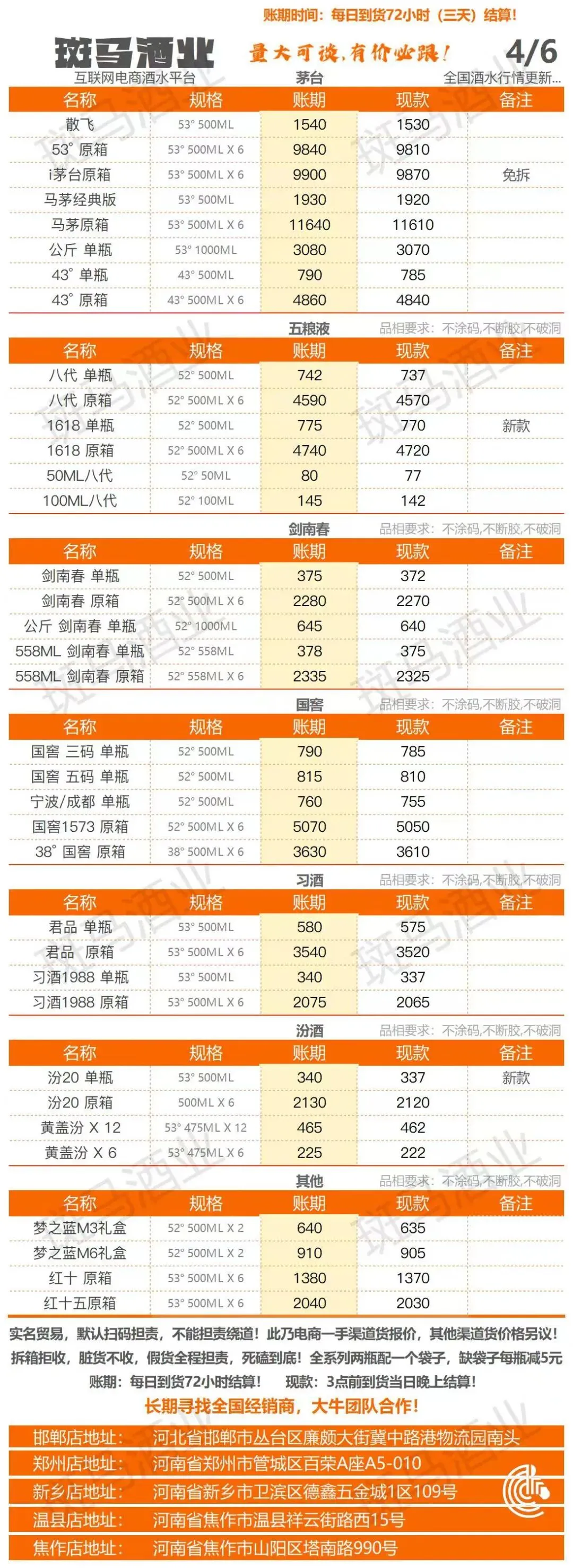>斑马酒业 26/4/6 采购行情报价