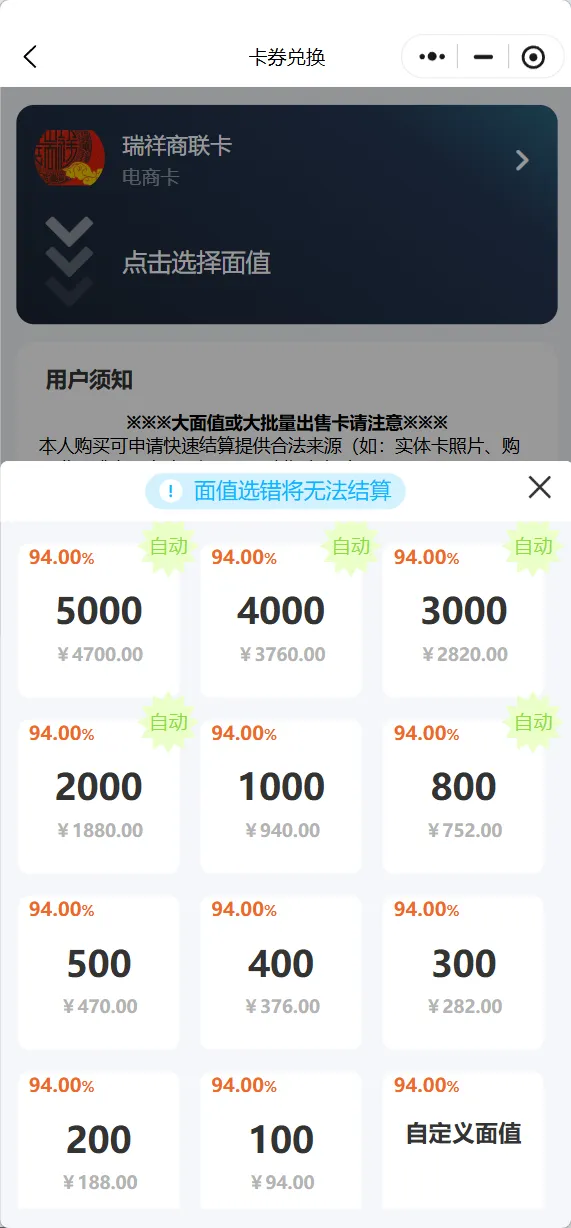 从团团收平台来看,瑞祥商联卡回收大致在 94折左右。换算下来会更直观一些: