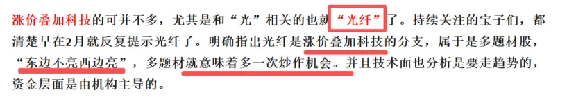 选择上有没有什么技巧?那就是前面讲的多题材方向。比如反复说的涨价叠加科技的“光纤”,东边不亮西边亮”,“多题材多一次机会”。周四涨价线涨,光纤涨;周五科技反弹,光纤继续涨,最强的再创历史新高!
