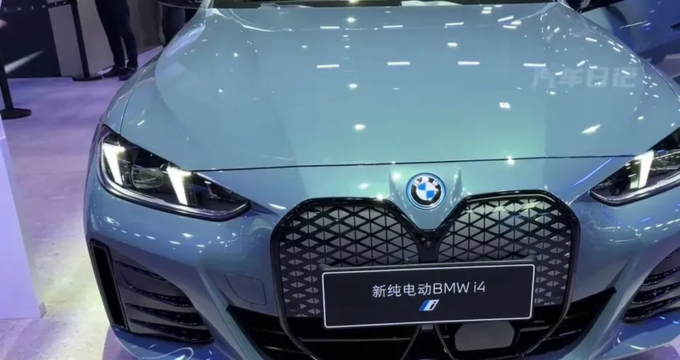 蓝色宝马i4纯电动车前脸展示