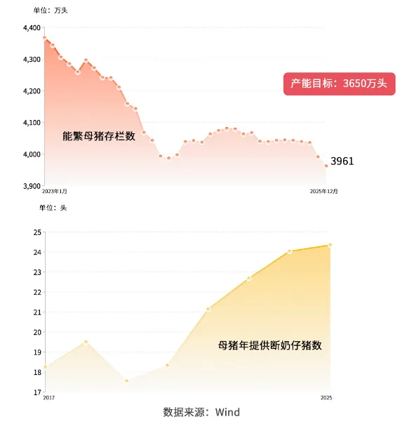 2024年4月能繁母猪存栏量达到低点,之后这个数据一直在低位徘徊,2025年末全国能繁母猪存栏量为3961万头,但农业农村部最新设定的调控目标已下调至3650万头。这意味着,市场认为目前产能仍过剩,市场供给过多,猪肉价格仍将持续下跌。