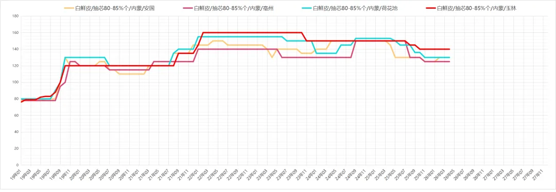 白鲜皮行情持续低迷,目前市场存量仍较丰,经营商们也多苦无销路,纷纷持仓观望,价格继续保持疲软,抽芯率85%左右的货售价110-120元;抽芯率90%的货135元。
