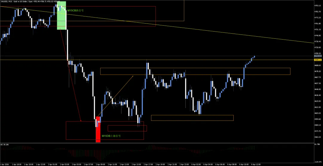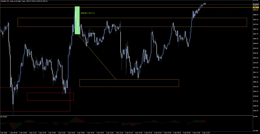 5.M5的CB下跌信号到达TP2之后就展开反弹,其实这个下跌信号只是上涨途中的回调,因为图1中的M15DB上涨信号没有被跌破。如果后续图1中的M15DB上涨信号被有效跌破,我们就要看4800这个位置形成的H1级别的CB下跌信号,目前这个信号只达到TP1,TP2的区域是4489.19-4528.83,TP3的区域是4294.10-4360.93。