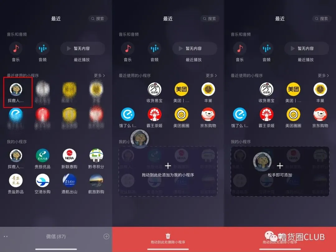 打开微信---下拉找到「探鹿人报价」小程序---长按拖动---添加到「我的小程序」