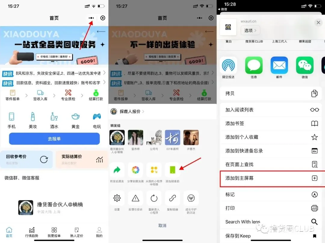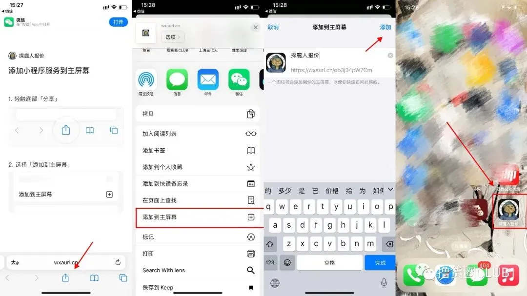 打开「探鹿人报价」小程序---点击右上角三个点---点击「添加到桌面」---「添加到主屏幕」---跳转到浏览器后点击底部「分享」---「添加到主屏幕」