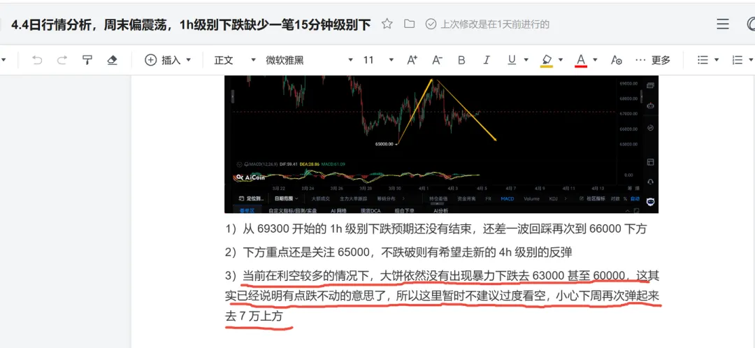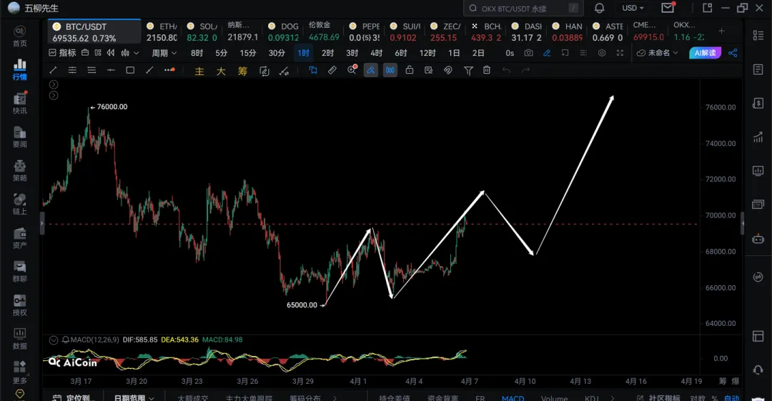 2)当前第三笔1h级别的反弹应该是没有结束的,后续还能再往上走走,上方先看72000附近能否摸到。后续观察是否盘整一个1h级别的中枢然后再向上延伸。