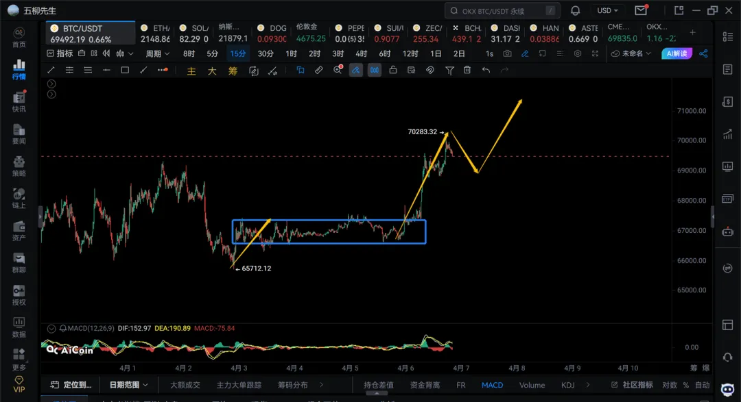 3)15分钟级别回调走完以后,看下一笔15分钟级别的反弹能否去到71500~72000附近