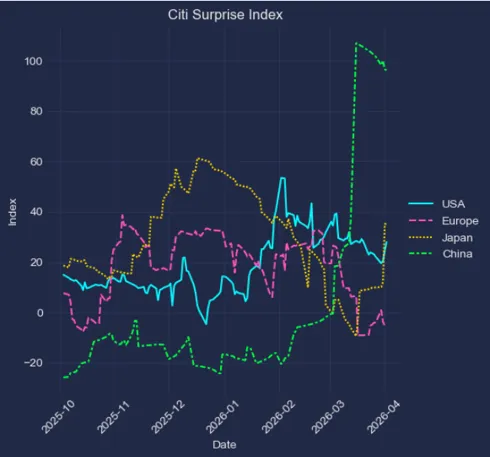 花旗经济意外指数:美国边际反弹,中国维持强势