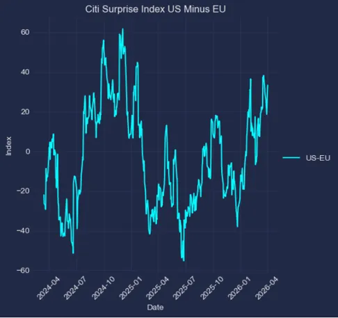 美欧花旗经济意外指数差值:在前高附近跃跃欲试