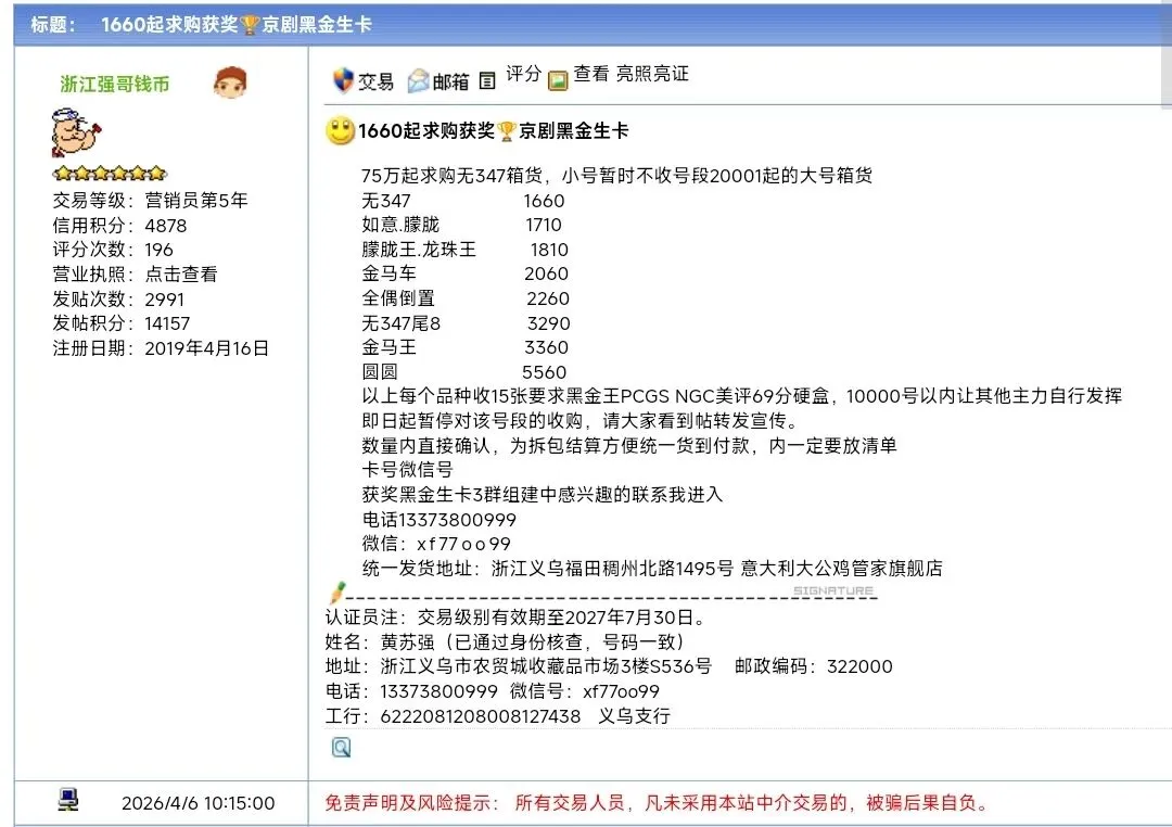 浙江强哥2026年4月6日求购贴: