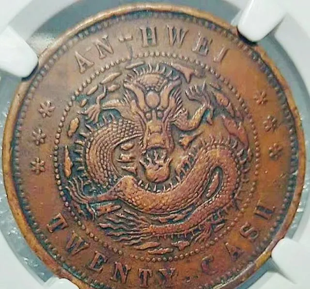 这枚铜元一看龙头就带劲,叫**“安徽二十文”**,铜色带暗,边上印着英文拼音,圈圈外一龙昂着头,身子绕成一团,火焰和云点缀四周,听年长的说,这种币过去流通量没湖北大,所以见着都觉得稀罕。想以前,老一辈爱把这币收在小匣子里,说它“镇箱底”,外人可轻易碰不得,现在轮到拍场成天吵吵“安龙出好价”,谁手头有几枚品相端正的,一亮相就有人加码。