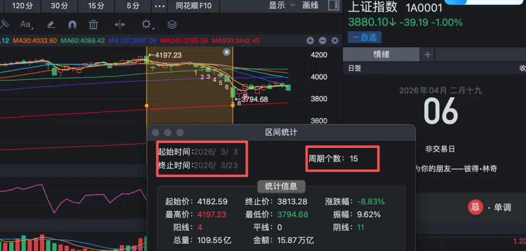 3.3日最高点4197.23,3.23日最低点3794.68,下跌周期15个交易日。3.23日往后推15个交易日反弹周期应该在4.14日。清明节前是杀跌的,所以下周整体应该是反弹预期,可能会好做一点。