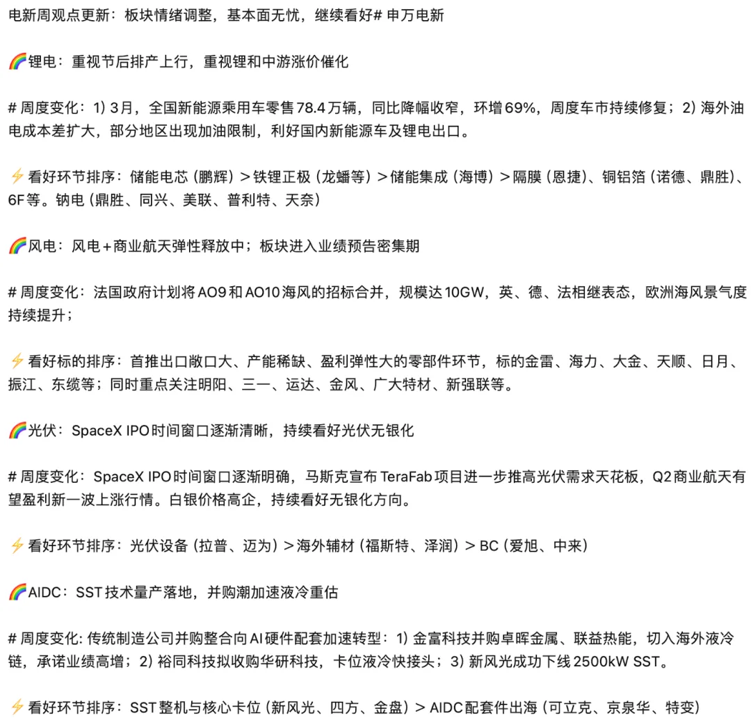节前顺科技加强的是光纤和osc,主要是光通信拒绝回调,这个位置只能是低位博弈思路,性价比可能会高一点。科技预期差应该在算力tokenor机器人,属于赔率品种,类似之前的商业航天。CCL今晚吹的比较多一点,胜宏董事长吹的也比较狠,主要是建滔年内第二次涨价。新能源我觉得还是锂电可能会强一点,虽然这波已经止盈了,后面还是看轮动新高预期。