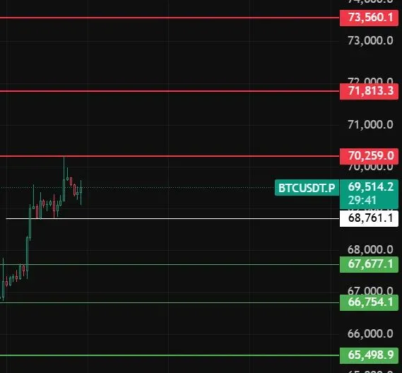如果夜间回踩跌破68760这个位置,那1-2小时级别开始回调,下方支撑位留意67680-66450-65500这几个位置附近!