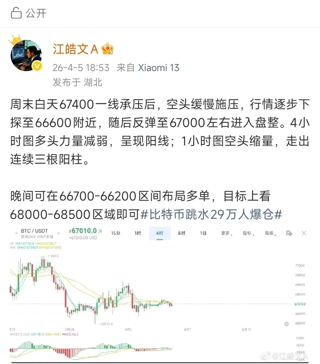 上周日晚间,我们已提前建议在66800附近布局多单,果断入场。周一早间行情强势拉升至69000左右,获利明确。