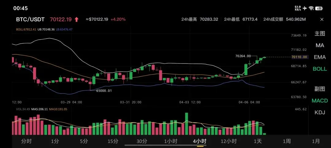 2026年4月7日比特币行情操作建议(BTC/USDT)当前行情(约$70,122,已触及布林上轨$70,148),以下操作建议供参考: