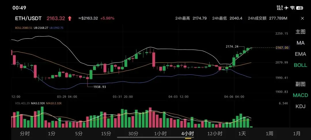 2026年4月7日eth行情操作建议,当前价格约 **$2,163**,24小时涨幅 **+5.98%**,高点 $2,174.79,低点 $2,040.4。价格已接近布林带上轨($2,168.27),与比特币走势类似,但ETH涨幅更大。