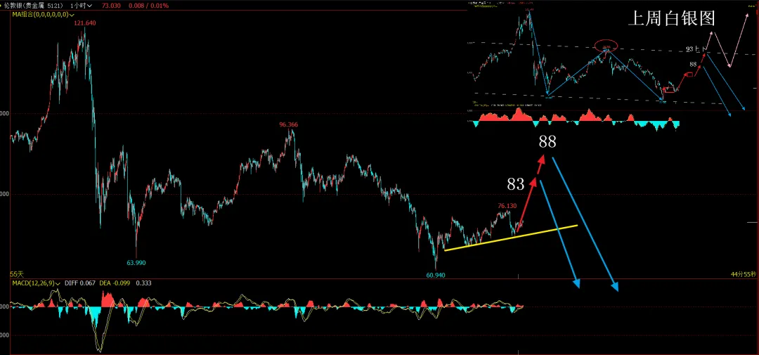 如果白银走3浪,那么爆冲一波就会向下;如果走5浪就是上周的图,先磨叽再冲一波才会向下。要看上冲的高度,目前我把白银的预期从上周的88、93下调到了83、88这两个区域,当然还需要根据走势进行具体的研判。走势结构可以参考,但点位肯定不准,包括黄金的点位,再次强调,我早就算不准黄金白银的点位了,误差特别大。