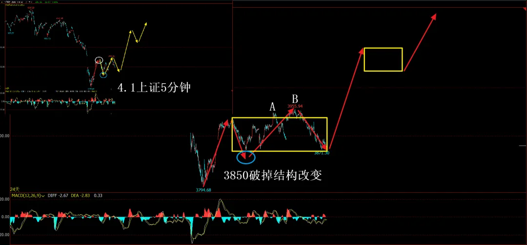 4.1那天我发了一张上证指数的5分钟图,如果看不清可以去看4.1的文章。我在文章里说如果不跌破3852的话,那就有可能向上拉升一波,但是别期待太多,正常来说过不了4200。之后上证指数跳空高开,改变了小结构,小顶从A点跳到了B点,目前这个5分钟的格局并未改变。如跌破3850才会改变这个5分钟的格局,行情或许会继续探底。不过就算跌破,整体格局也并未改变,不过是C走abc还是abcde的问题。