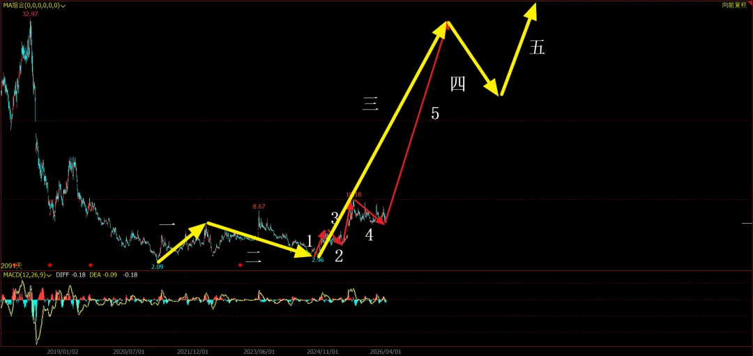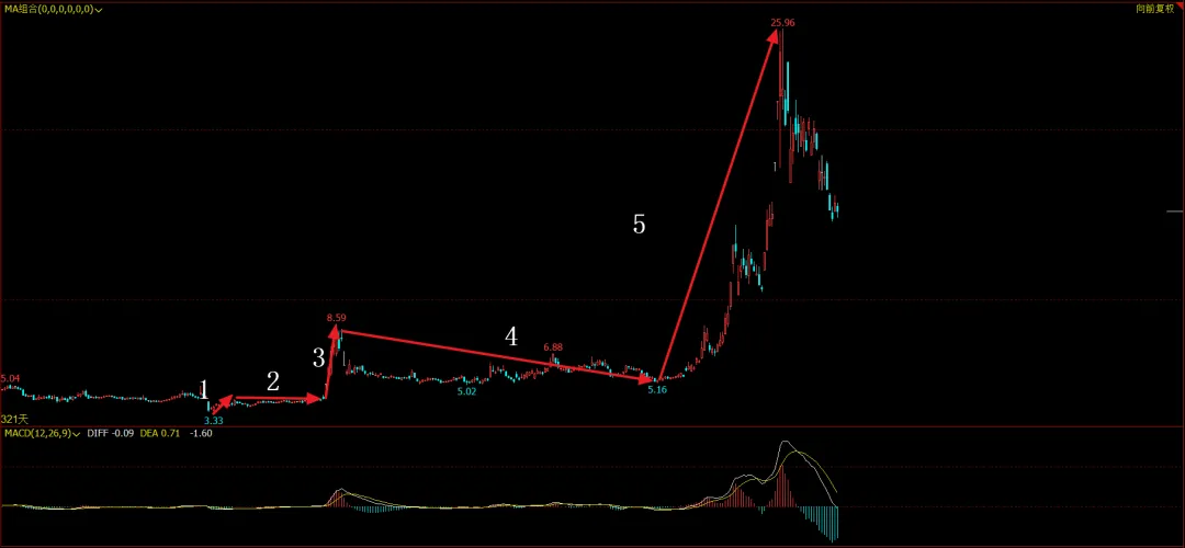 这只股票目前处于大三浪的第5浪,非常关键的一点是在这个大三浪中,第3浪并未延长太多,2浪的时间是4浪的1/2,这种走势在第三浪里很少见,比较常见在第五浪,也就是说,这只股票要走第三浪的第5浪延长。人话:即将启动暴涨,目标甚至可以看3倍!如果朋友们遇到这样的股票,尽量别被甩下车。我找了一个差不多走势的股票,大家可以参考一下,如果等这只股票真走完第5浪,还需要比较久的时间,大家可以看看下图这个延长的第5浪是怎么走的,又翻了多少倍。感谢朋友们看到这里,谢谢。本文思路仅供参考,不作为操作依据。