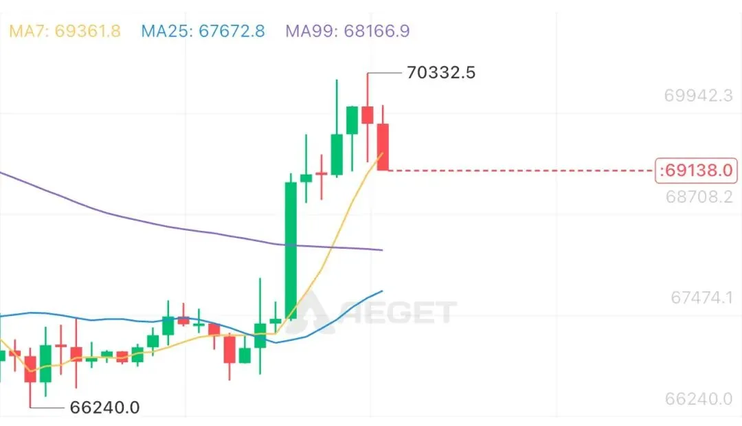 BTC于凌晨时段放量突破70000整数关口,随后进入高位震荡修复阶段,多空博弈加剧,盘面呈现冲高回踩、窄幅整理格局。短线虽有技术性回撤,但多头结构完整,主导权仍在多方,日内震荡整固完成后,价格具备进一步向上试探新高的动能。