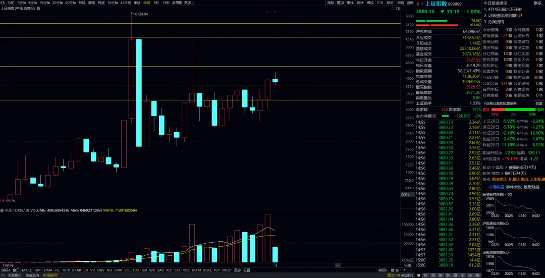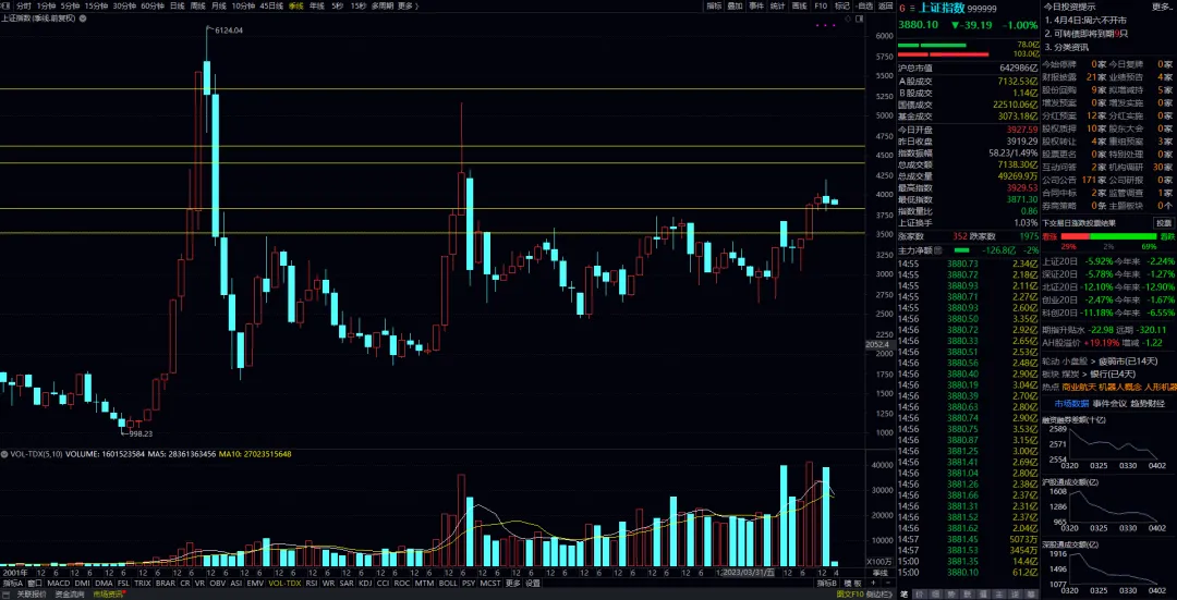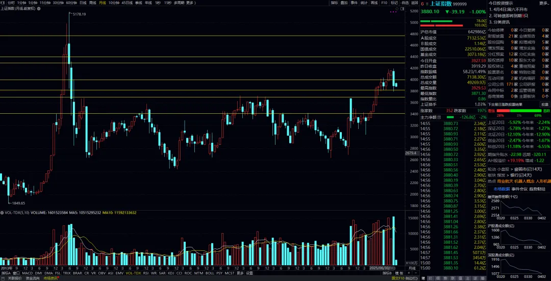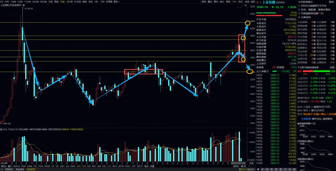 上证指数月线标注图,3400-《3700-3810-4000-4300-4400》。月结构图表上走势在3700上方为相对强势区域,目前在4000附近上下震荡。