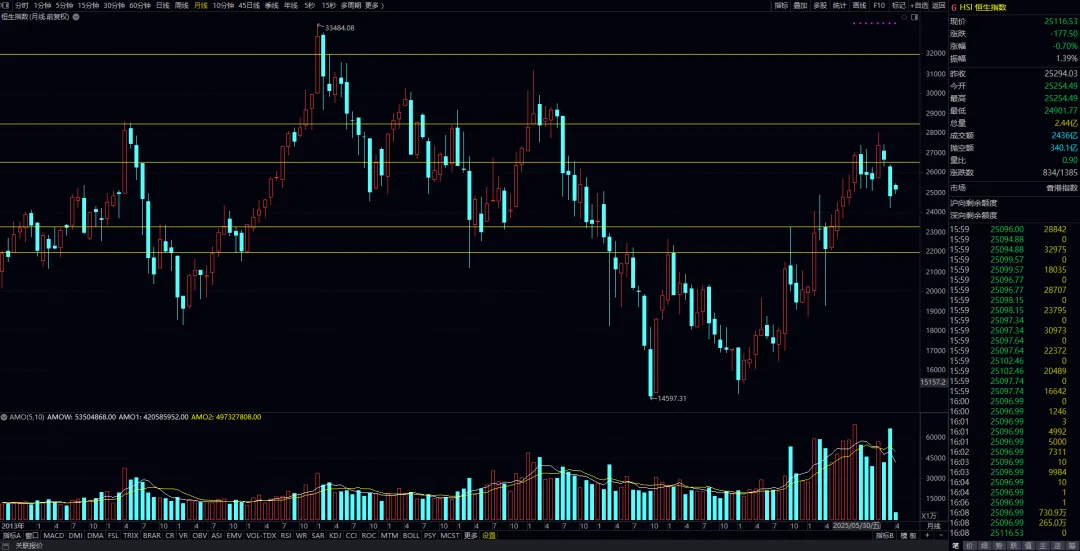 恒生指数月线图,《22000-23300-26500-28500-》32000。月结构图表上主运行区域在23300-28500之间,目前处于加速后的震荡阶段,波动率较大。