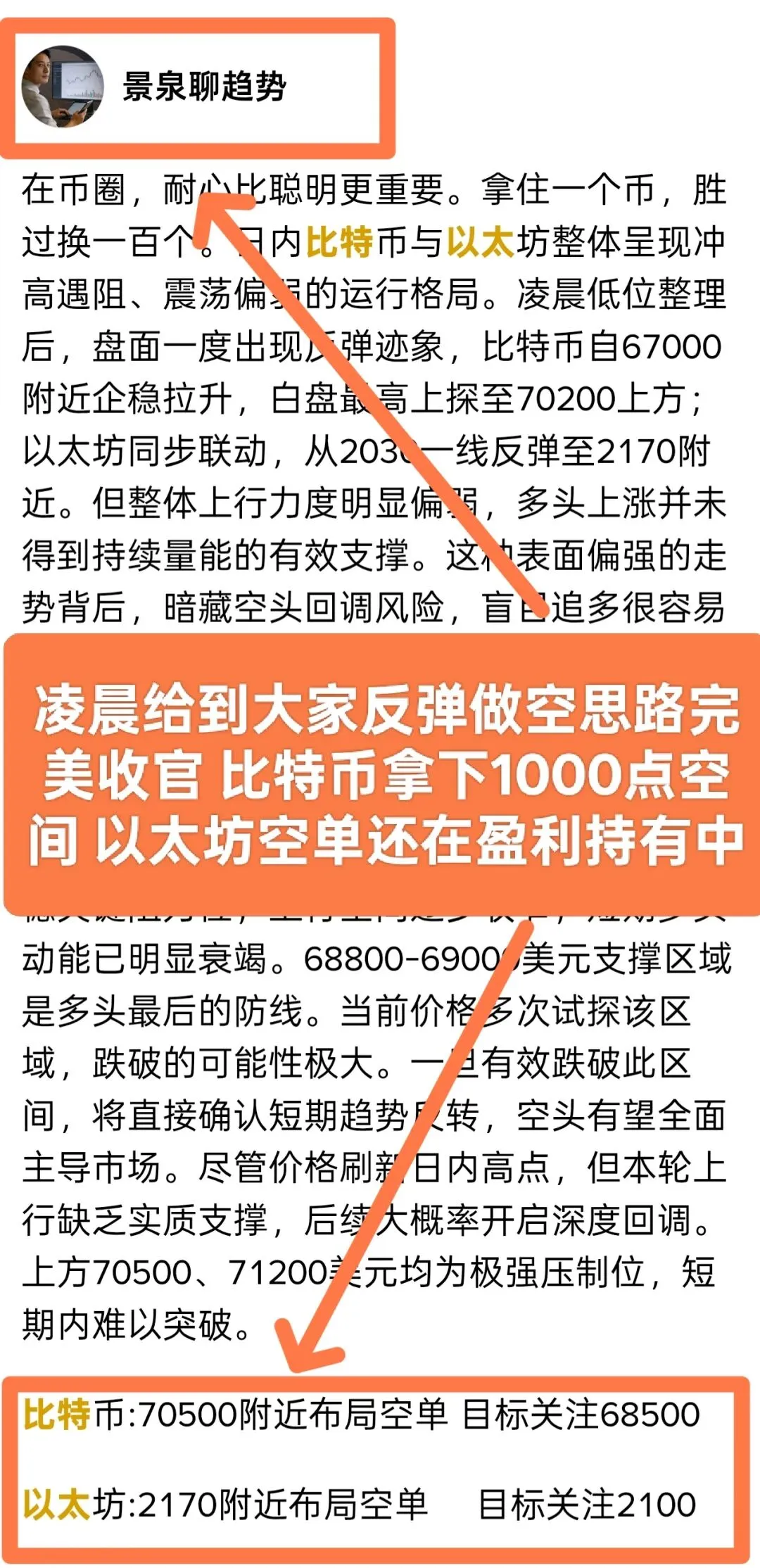 “每一轮洗盘都是为了更高的启航。咬住青山不松口,你的坚持终将伟大。”回顾凌晨比特币以太坊行情,比特币自凌晨在70330高点一路回踩截止当前最低来到了68227低点,以太坊则同步比特币走法在2167高点一线下探至2086低点。我们凌晨看空思路如下兑现,景泉在凌晨带领学员布局比特币以太坊空单,比特币拿下1000多点,以太坊空单目前还在盈利持有中。