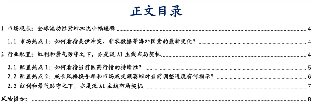 配置热点1:如何看待当前医药行情的持续性?创新药在2026Q1季度BD出海高景气及学术会议催化下,近期表现亮眼,但我们认为这可能属于滞涨情况下的补涨行情,短期(周度)预计仍是市场热点,但预计难以演绎出持续超额收益机会。2025年9月至本轮医药启动前,医药跌幅靠前属于滞涨品种,同时恰逢近期市场波动以及BD和会议预期催化,这具备典型市场波动环境下滞涨板块补涨的特征。能否演绎出类似2025Q2-Q3持续超额收益行情?与之相比:一是市场环境偏弱,彼时市场存在β上涨环境,而当前β整体仍受海外风险偏好抑制,这是影响行情持续性的极其重要条件;二是催化效度偏弱,尽管均受BD催化,但彼时属于0到1,而当前属于1到N,催化效度不如彼时。假若医药行情欲具备持续性机会,可能需要β环境改善叠加医药业绩大超预期,但同时具备这两项条件的难度较大。配置热点2:成长风格换手率和市场成交额萎缩对当前调整进度有何指示?参考历史情形,当本轮成长风格换手率触及2.2%左右可能预示第二阶段上涨行情将至,近期低点为2.5%仍有一定下行空间。同样参考历史,若市场成交额降至40-50%区间也意味调整临近尾声,本轮成交额已降至前高的42%,指示调整已近尾声。此外结合我们提出的判断第一次良性调整期结束“β+α+2大特征”框架,当前市场风险偏好β仍有波折、产业业绩α有待年报和一季报验证、成长风格调整时间和空间尚有小幅差距(幅度距离历史可比仍有3-8%空间,预计调整将偏区间中值)。整体看,第一次良性调整期尽管并未结束,但继续下行空间已非常有限,因此当前实际上处于较为优异的布局时机。可根据一个直观指标即当成长风格换手率降至2.2%左右时,本轮良性调整期有望结束从而进入第二阶段上涨行情。