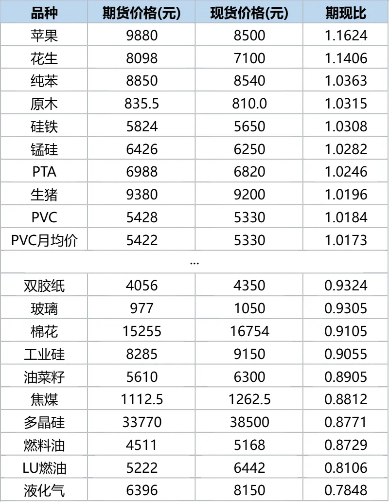 说明:期现比=期货主力合约价格/现货价格,大于1为期货升水,小于1为期货贴水。
