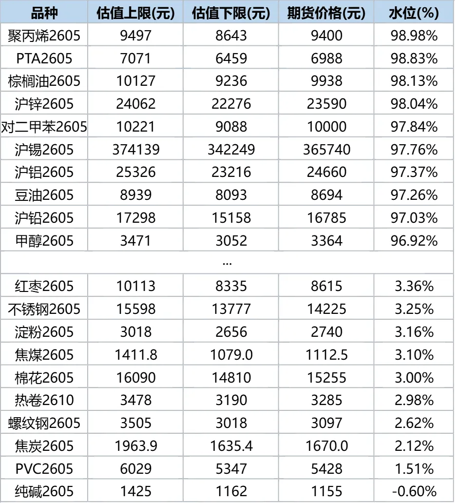说明:估值上限、估值下限数据采自文华财经的多因子估值数据库,价格水位= 当前期货价格/估值数据,价格水位处于0值附近代表当前期货价格处于低位;价格水位处于100%附近代表当前期货价格处于高位。