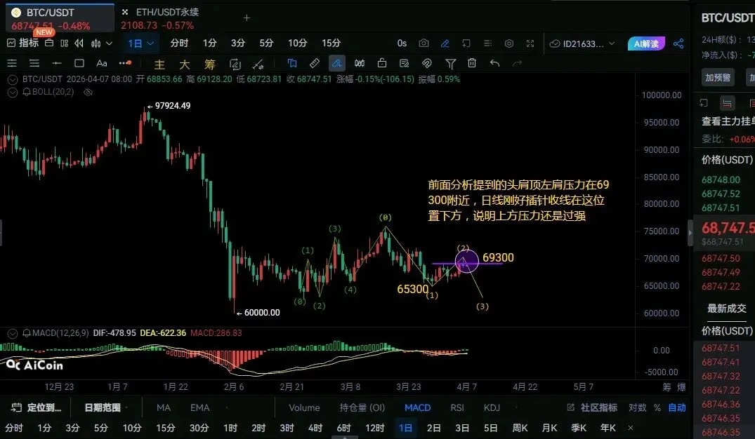 大饼行情分析:日线当前走势插针收在之前分析中提到的69300头肩顶左肩压力位下方,说明上方抛压极强,当前处于反弹遇阻后的方向选择阶段。指标MACD在零轴上方金叉后红柱缩量,多头动能衰减,反弹乏力;若无法突破69300,将开启3浪下跌,下探65300,若跌破则确认头肩顶形态,目标64100;若放量突破69300,形态失效,反弹延续。