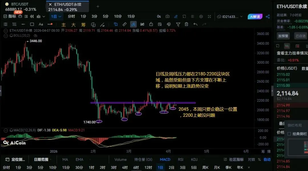 以太行情分析:日线/周线压力集中在2180-2200区域,虽受阻,但下方支撑持续上移,短期上涨趋势未变。指标MACD在零轴上方金叉,红柱温和放量,多头动能仍在;本周只要企稳2045上方,将突破2200,延续上涨趋势;若跌破2045,短期趋势转弱,下探1900一线。