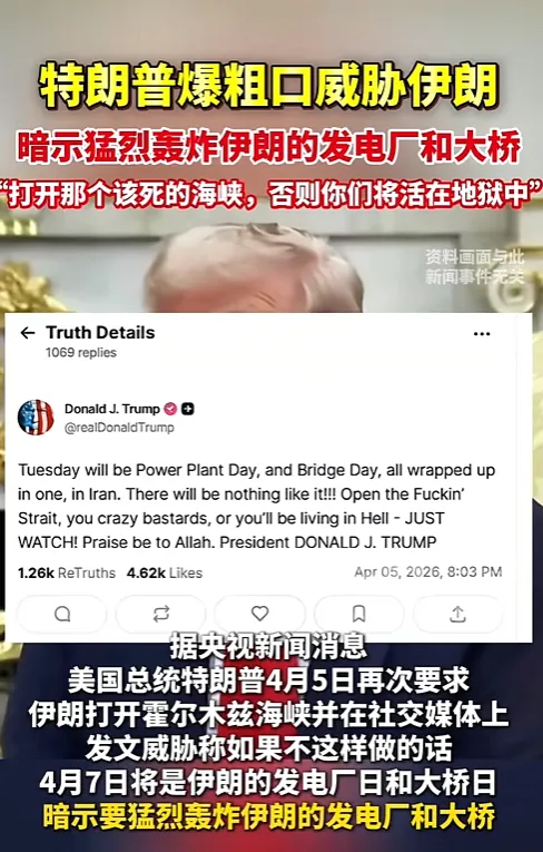 咱先说说他放的那通狠话,真是离谱他妈给离谱开门,离谱到家了!他明明白白划了道死线:美东时间 4 月 7 号晚上 8 点,就是伊朗达成协议的最终期限,要是敢逾期,美军直接发动一场 4 小时的空袭,伊朗境内所有的桥梁、发电站全给炸个稀烂,让这个国家一夜之间就彻底垮掉,还放话这事没准 7 号晚上就得干。
