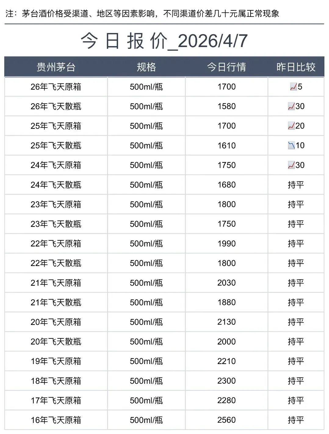 飞天下跌;4月7日茅台酒行情(附回收价格)