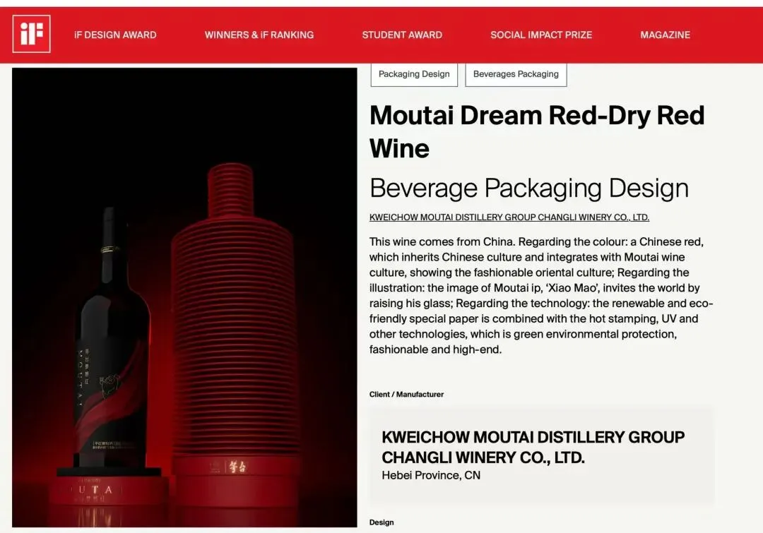 另一款获奖产品”茅台梦·干红葡萄酒“,包装设计延续茅台品牌基因,兼具东方韵味与红酒优雅。