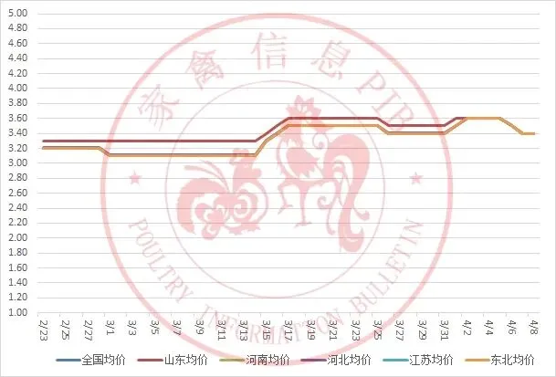 2026年2月23日-2026年4月8日主流地区白羽鸡鸡苗均价走势图
